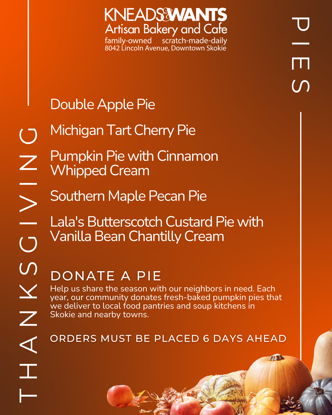 The days leading up to Thanksgiving are unlike any other at Kneads & Wants. With hundreds of pies to bake in our two ovens, the bakery is working at full speed. To keep everything on track, we are unable to take catering orders or accommodate special requests during this time. Thank you for your understanding and for allowing us to focus on making each pie perfect.